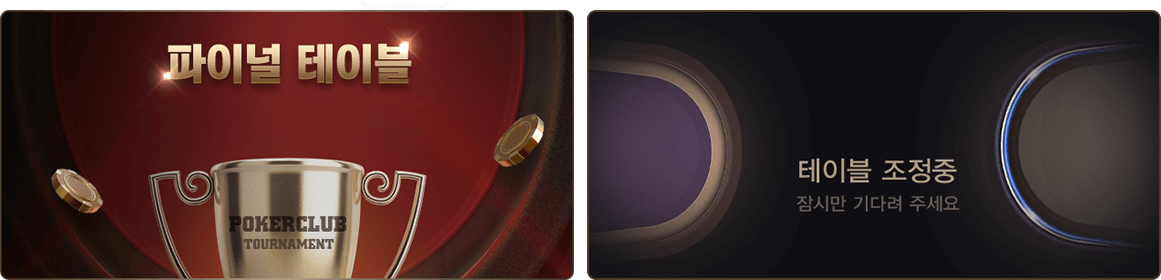 상금 지급 랭크에 들어간 경우 상금을 지급받을 수 있고, 상금 지급 인원은 참여 인원수에 비례하여 설정됩니다. 토너먼트 설정에 따라 6인 혹은 9인의 플레이어가 남게되면 남은 플레이어는 모두 파이널 테이블로 이동합니다. 파이널 테이블에서 남은 모든 칩을 가져온 플레이어는 토너먼트에 우승하게 됩니다.