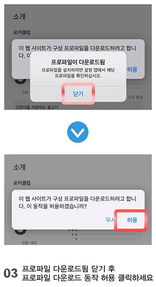 - 03프로파일 다운로드 됨 닫기 후 프로파일 다운로드 동작 허용 클릭하세요